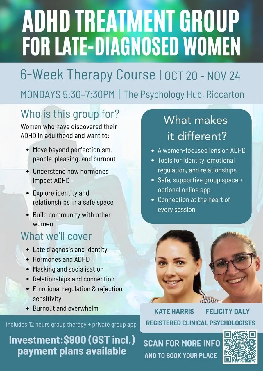 For more information scan the QR code, or alternatively use the following link: ADHD Therapy Group for Late-Diagnosed Women | Christchurch Course